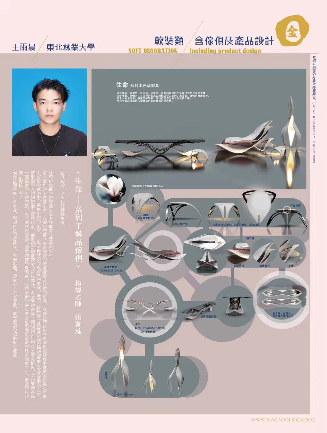 11月29日,由澳门国际设计联合会(Union for International Design of Macao)举办的2021“金莲花杯”国际(澳门)大学生设计大赛颁奖典礼及获奖作品展开幕式在澳门理工学院氹仔校区理工演讲厅及理工艺廊举行。由我院工业设计专业张言林教师指导,2019级工业设计专业王雨晨同学设计的作品《生命系列工艺品家具》,经过大赛评委层层筛选,最终拔得头筹,获得2021「金莲花杯」国际(澳门)大学生设计大赛软装类金奖,清华大学获得建筑类金奖,广州华商学院获得室内空间类金奖。